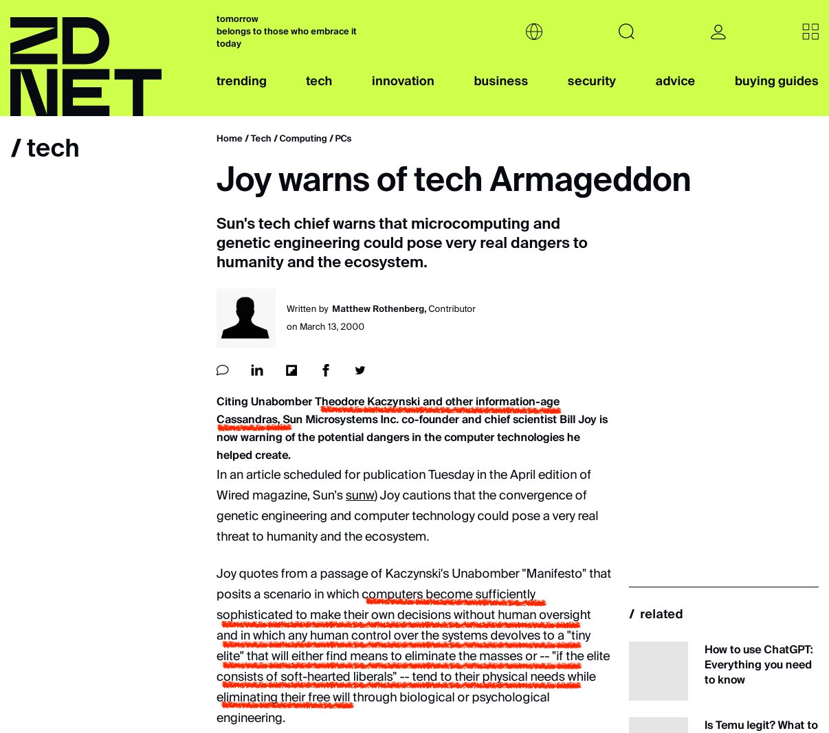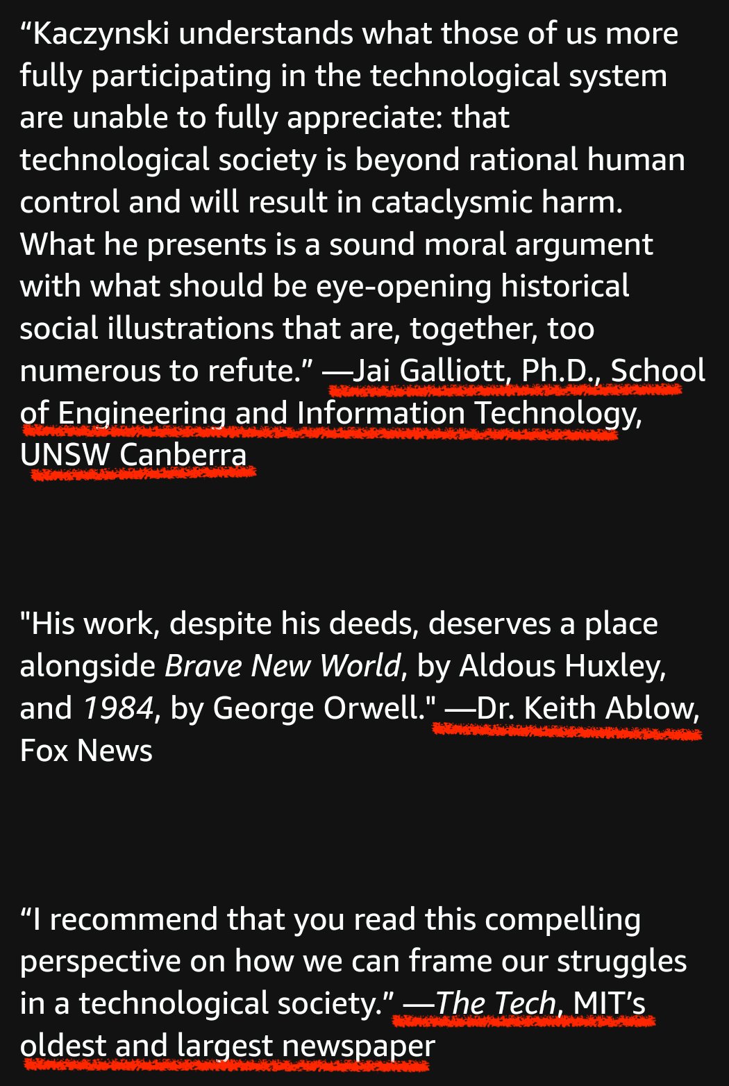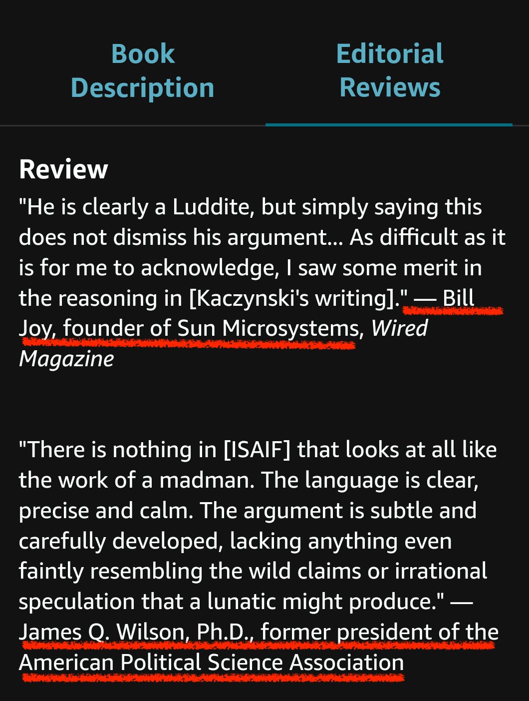 A few years before “Covid Times A.D.” I learned that Kaczynski’s writings were glowingly reviewed by prominent people and “captains of industry”, like the founder of Sun Microsystems.