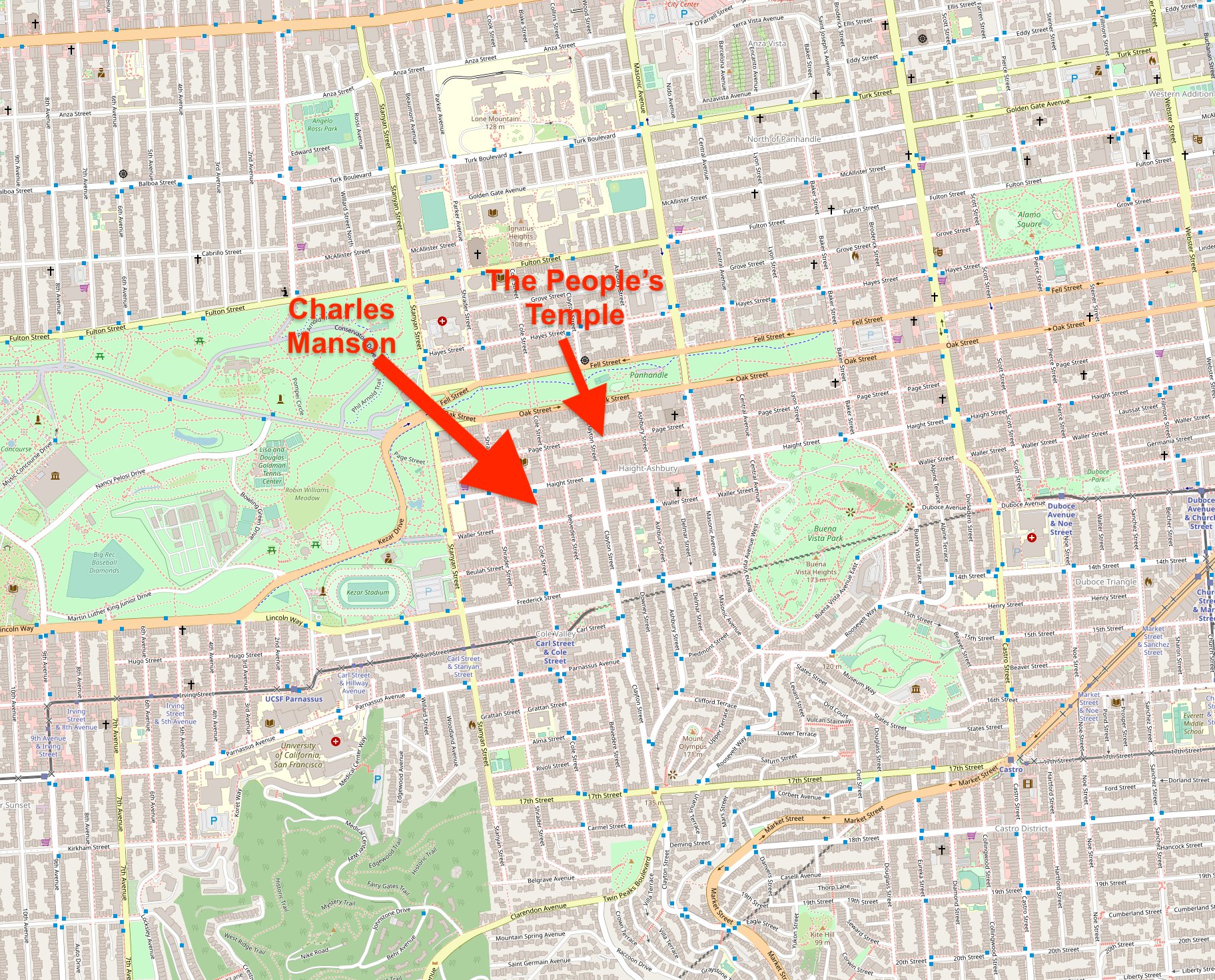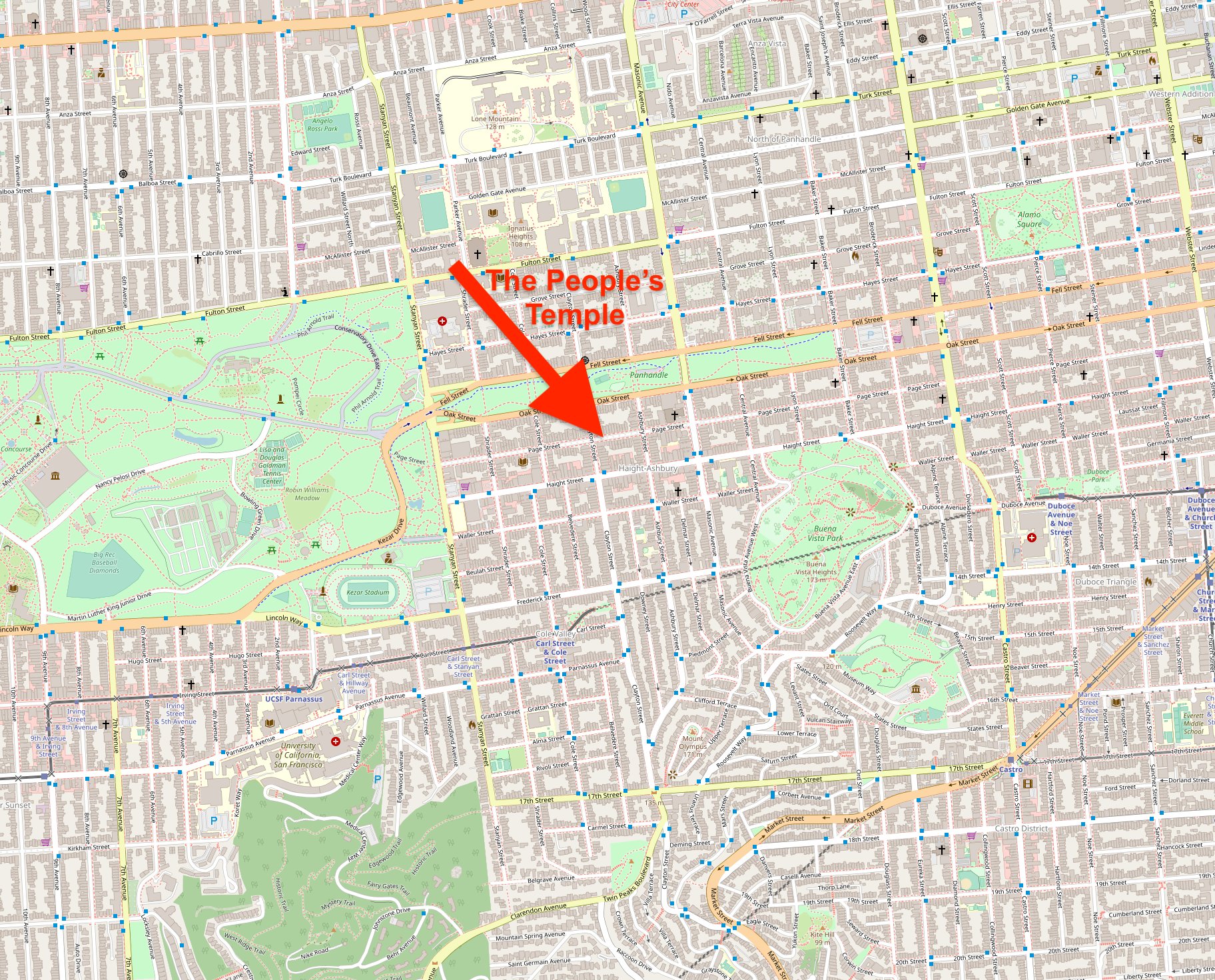 Turns out, a good chunk of these people came from inner city. Specifically San Francisco. The People’s Temple. It is marked here on this map. We’ll start with this marker, but add more markers as we explore the other neighbors of the People’s Temple.