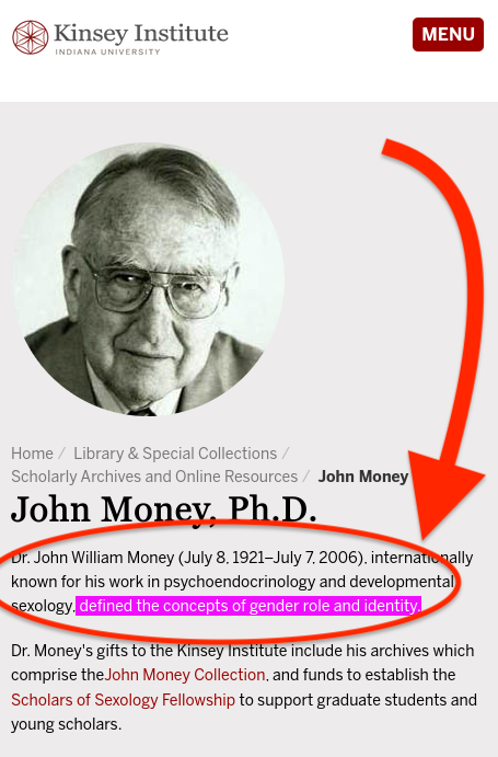 John Money (the psychologist that helped contribute to “sex and gender studies” coining the terms “gender role” and “gender identity”) did horrible experiments on children.