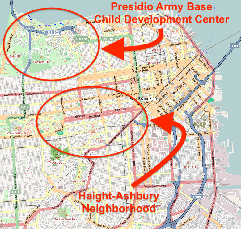 Here is that base relative to Haight Ashbury. This story (like many of these) can tentacle in many different directions, but it is noteworthy that a Colonel who I have mentioned before [1] ( author of “The Satanic Bible”) was implicated in articles about it.