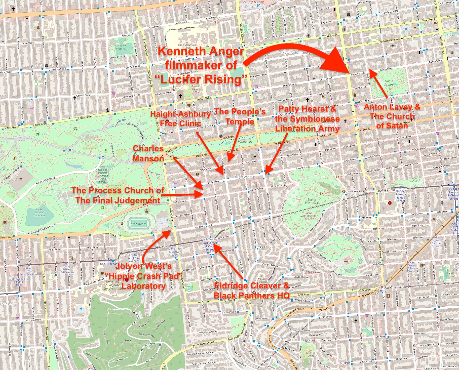 Kenneth Anger the occultist/filmmaker was also in Haight-Ashbury. He was in a house nicknamed “The Russian Embassy” (1198 Fulton St). He filmed “Lucifer Rising” there and in the area.