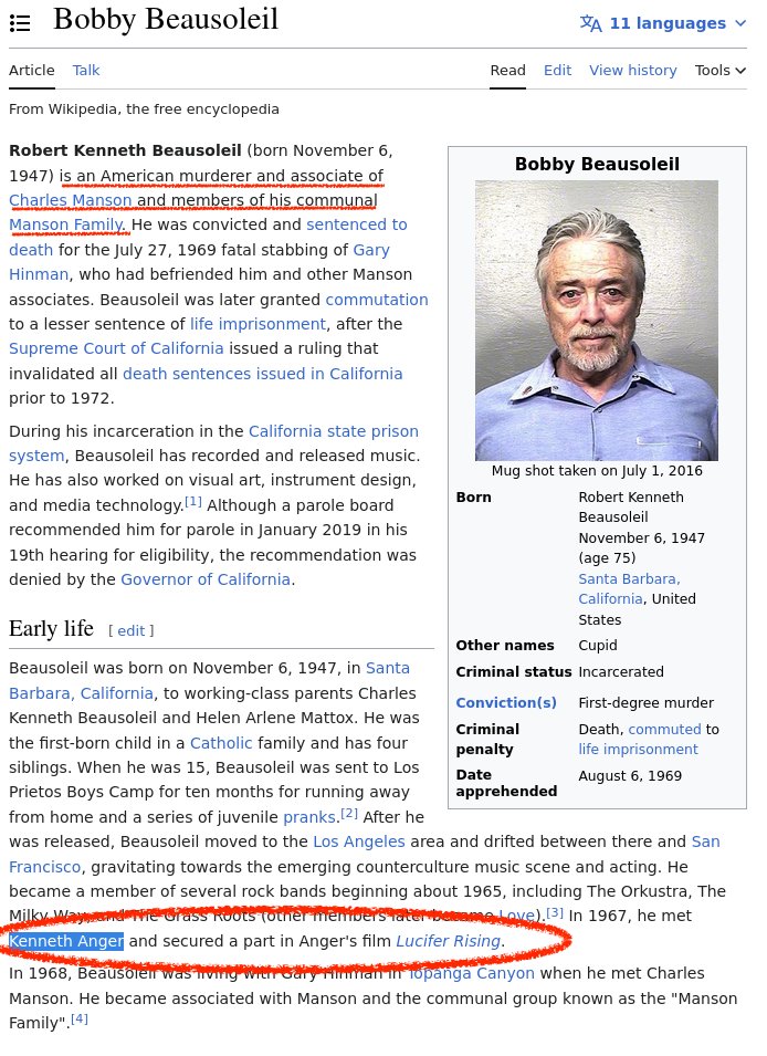 What else? Anton LeVey. Founder of Church of Satan. But also connected to the Manson family (through a woman named Susan Atkins who worked for him that eventually joined the Manson family).