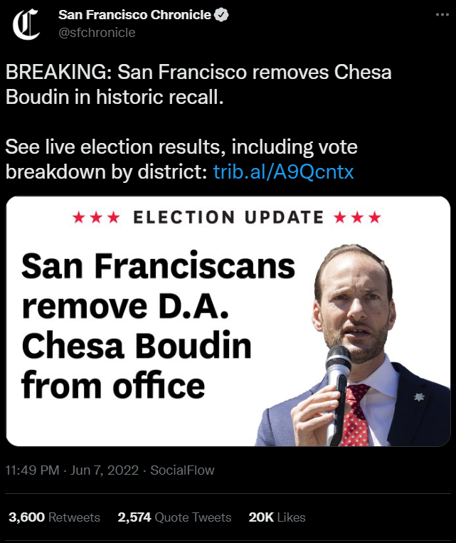 The now-recalled DA of San Fran is Chesa Boudin. He’s associated with the infamous Open-Societies Foundation. Boudin had to be raised by other people because his parents were serving prison terms.
