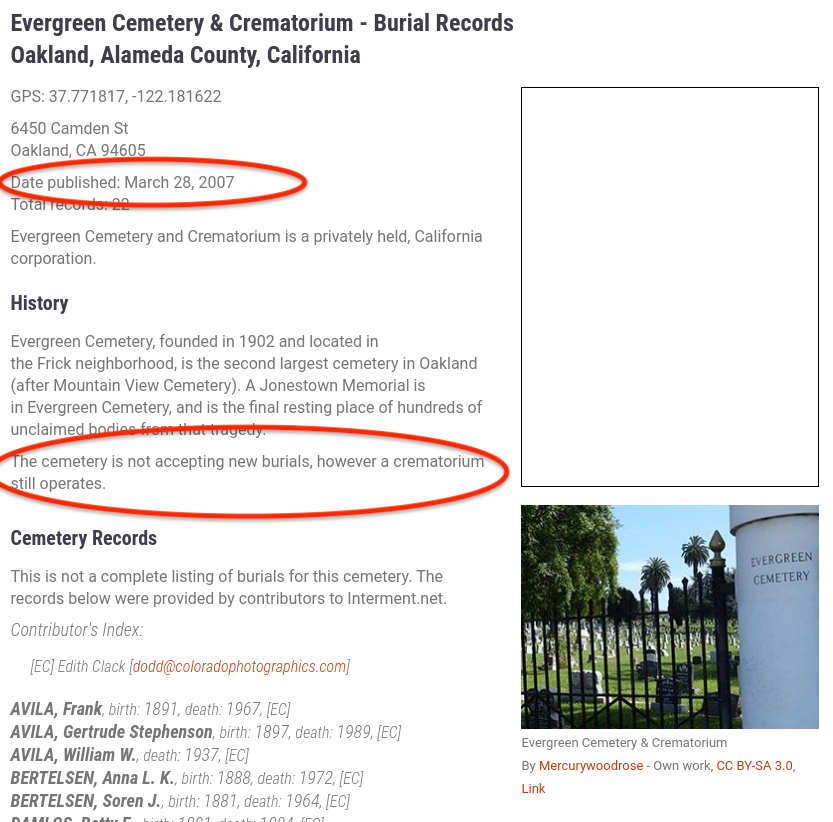 These bodies were tranferred to and buried in the otherwise closed Evergreen Cemetary.