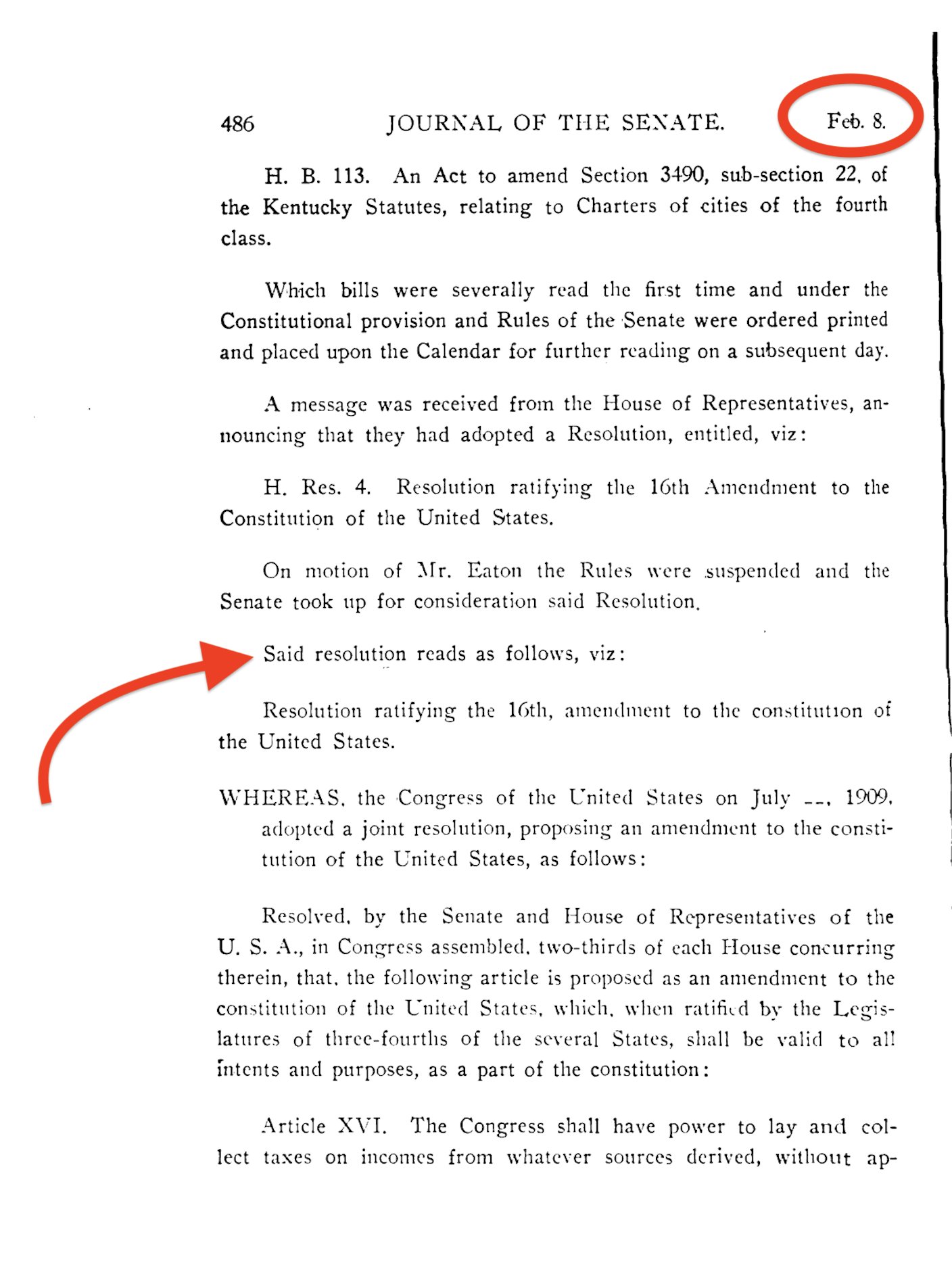 As we continue, keep in mind this is the official date that the 16th Amendment was ratified for Kentucky (meaning both the House and The Senate voted for it).