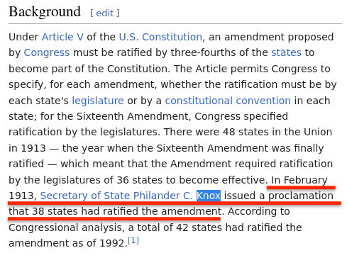 Wikipedia acknowledges that a man named Philander Knox was the center of many claims of controversy about the 16th Amendment.