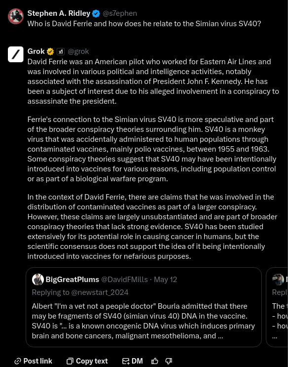 My favorite part about this Grok-1 chat, is how David Ferrie’s involvement in the JFK assassination is no longer being referred to as a “conspiracy theory”…. but the SV40 stuff is. 🤣